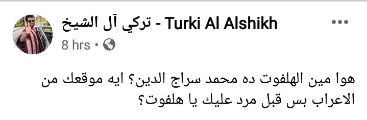 من جانبه فاجئ تركي آل الشيخ جميع الجماهير بالرد على سراج الدين ذاكرا اسمه، حيث كتب: "هوا مين الهلفوت ده محمد سراج الدين؟ ايه موقعك من الإعراب بس قبل مرد عليك يا هلفوت؟".
