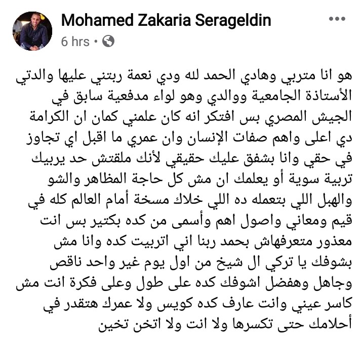 ليرد عليه سراج الدين: "هو أنا متربي وهادي الحمد لله ودي نعمة ربتني عليها والدتي الأستاذة الجامعية ووالدي وهو لواء مدفعية سابق في الجيش المصري بس افتكر أنه كان علمني كمان أن الكرامة دي أعلى وأهم صفات الإنسان وأن عمري ما أقبل أي تجاوز في حقي وأنا بشفق عليك حقيقي لأنك ملقتش حد يربيك تربية سوية أو يعلمك أن مش كل حاجة المظاهر والشو والهبل اللي بتعمله ده اللي خلاك مسخة أمام العالم كله في قيم ومعاني واصول اهم وأسمى من كده بكتير بس انت معذور متعرفهاش بحمد ربنا اني اتربيت كده وانا مش بشوفك يا تركي ال شيخ من اول يوم غير واحد ناقص وجاهل وهفضل اشوفك كده على طول وعلى فكرة انت مش كاسر عيني وانت عارف كده كويس ولا عمرك هتقدر في أحلامك حتى تكسرها ولا انت ولا اتخن تخين".