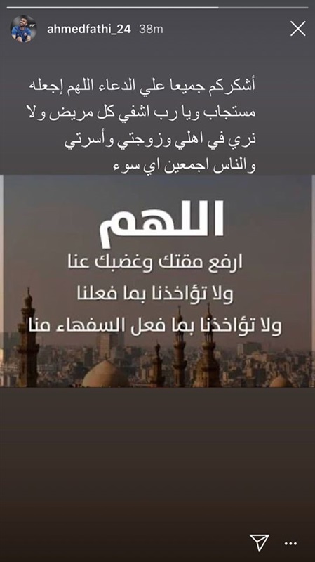 ونشر فتحي عبر ستوري "إنستجرام" صورة لدعاء وعلق: "أشكركم جميعا على الدعاء اللهم اجعله مستجابا ويارب اشفي كل مريض ولا تريني في أهلي وزوجتي وأسرتي والناس أجمعين أي سوء".