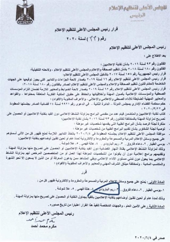 أصدر المجلس الأعلى للإعلام، برئاسة الكاتب الصحفي مكرم محمد أحمد، قرارا بمنع عدد من الإعلاميين من الظهور على الشاشة إلا بعد حصولهم على ترخيص من نقابة المهن الإعلامية وهم: بوسي الطيار، ودعاء فاروق، وريم البارودي، وهالة فهمي، وعلا شوشة.