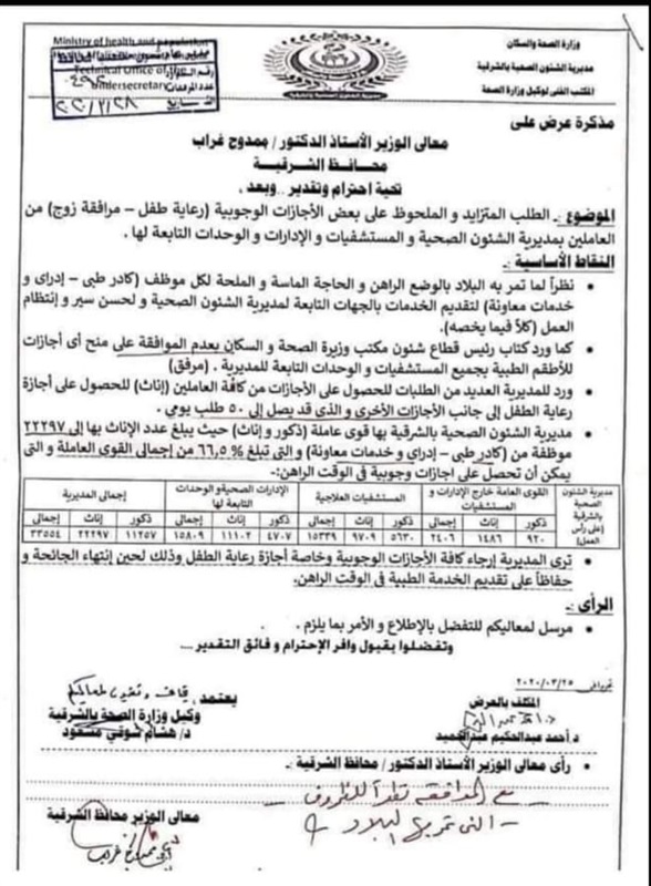 كما أوضحت المديرية، أن قطاع شئون مكتب وزيرة الصحة قد أصدر كتاب بعدم الموافقة على منح أى إجازات للأطقم الطبية بجميع المستشفيات والوحدات التابعة لها، مضيفة أنه ورد للمديرية العديد من الطلبات للحصول على الإجازات من كافة العاملين "إناث" للحصول على إجازة رعاية الطفل إلى جانب الإجازات الأخرى والذى قد يصل إلى 50 طلبا يوميا.