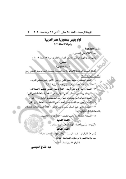 أصدر الرئيس عبدالفتاح السيسي، اليوم الثلاثاء، قرارا بتشكيل الهيئة الوطنية للإعلام، تضمن الإبقاء على حسين زين رئيسا الهيئة.