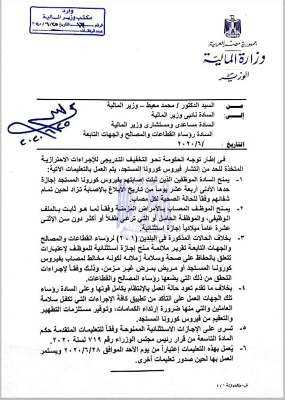 أصدر الدكتور محمد معيط، وزير المالية، قرارا بالعودة الجزئية تنفيذا لقرارات مجلس الوزراء بعودة العمل جزئيا وفقا لحاجة العمل.