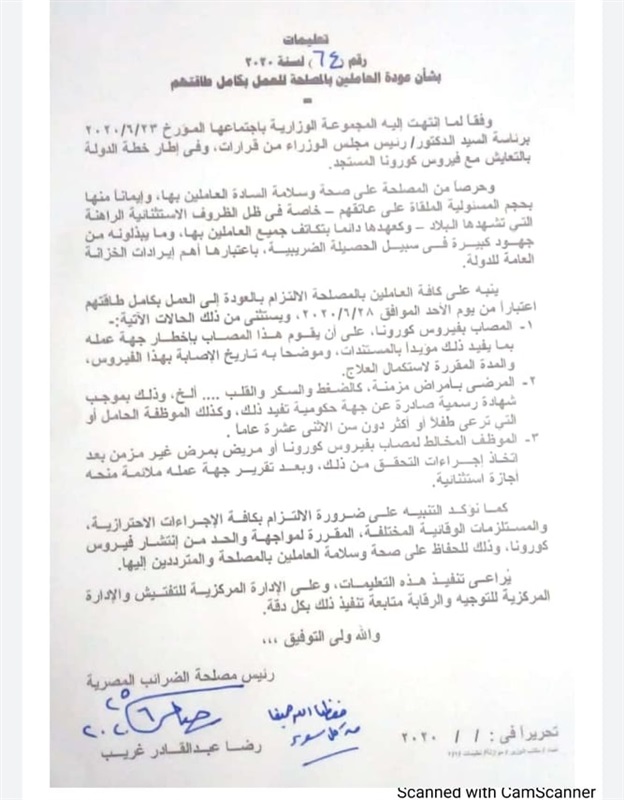 قرار وزير المالية لتسيير العمل بمصلحة الضرائب بناء على قرارات عودة العمل