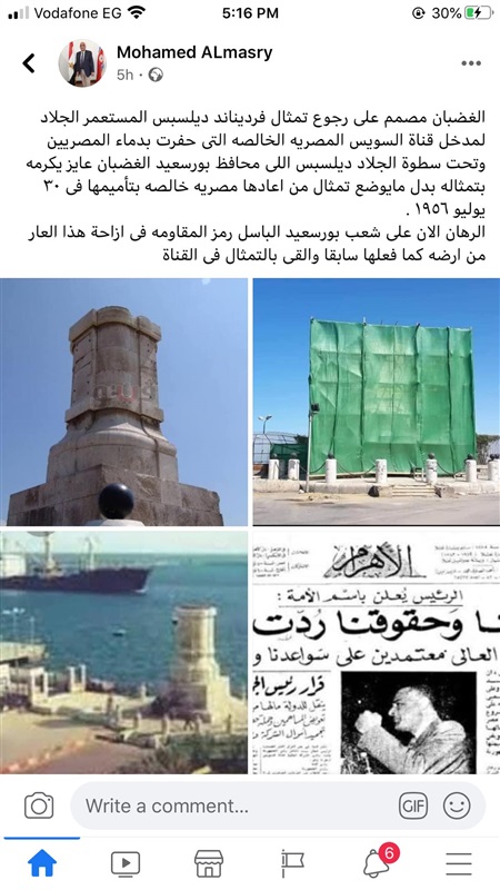 بينما قال محمد المصري: الغضبان مصمم على رجوع تمثال فرديناند ديلسبس المستعمر الجلاد لمدخل قناة السويس المصرية الخالصة، التى حفرت بدماء المصريين وتحت سطوة الجلاد ديلسبس، اللى محافظ بورسعيد الغضبان عايز يكرمه بتمثاله بدل ما يوضع تمثال من أعادها مصرية خالصة بتأميمها فى ٣٠ يوليو ١٩٥٦.