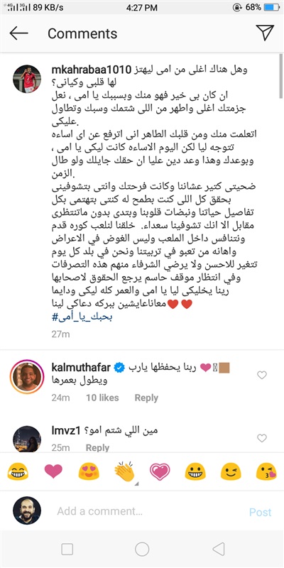 وكتب كهربا "وهل هناك اغلى من امى ليهتز لها قلبى وكيانى؟ ان كان بى خير فهو منك وبسببك يا امى ، نعل جزمتك اغلى واطهر من اللى شتمك وسبك وتطاول عليكىاتعلمت منك ومن قلبك الطاهر انى اترفع عن اى اساءه تتوجه ليا لكن اليوم الاساءه كانت ليكى يا امى ، وبوعدك وهذا وعد دين عليا ان حقك جايلك ولو طال الزمن.