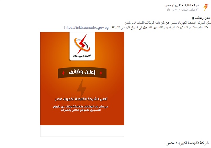 انتشرت العديد من الاستفسارات والتساؤلات خلال الساعات الماضية على خلفية ما نشرته بعض الصفحات على موقع التواصل الاجتماعي "فيس بوك" بشأن الإعلان عن وظائف شاغرة لجميع التخصصات والمؤهلات الدراسية والتى حملت اسم صفحة "الشركة القابضة للكهرباء".