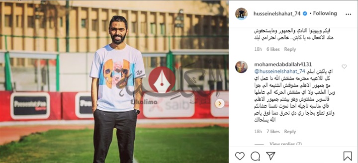 دخل حسين الشحات، لاعب الفريق الأول لكرة القدم بالنادي الأهلي في مشادة كلامية ساخنة مع أحد متابعيه عبر حسابه الشخصي على موقع التواصل الاجتماعي "إنستجرام".