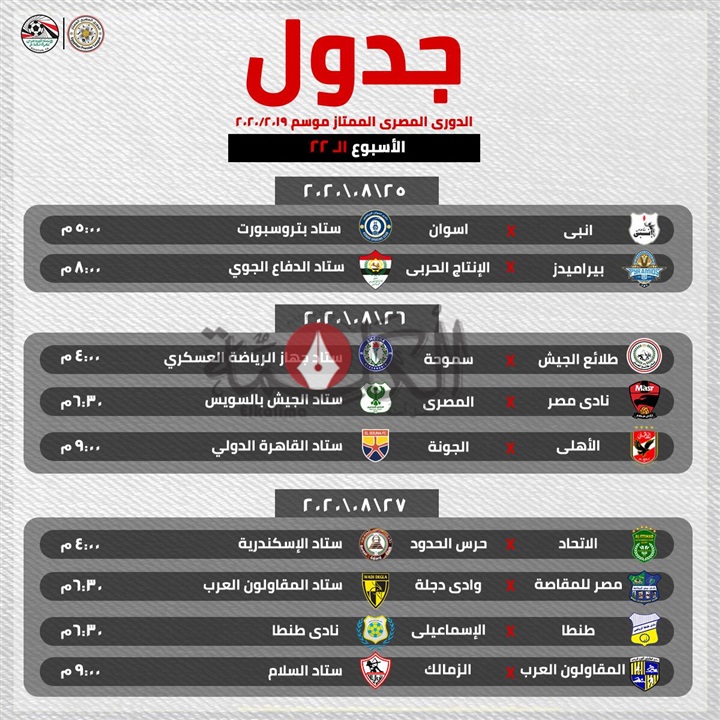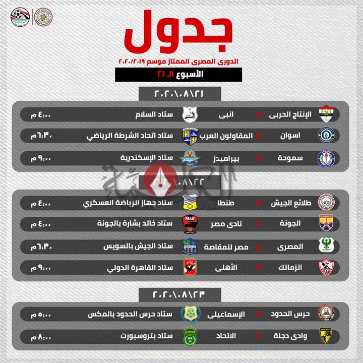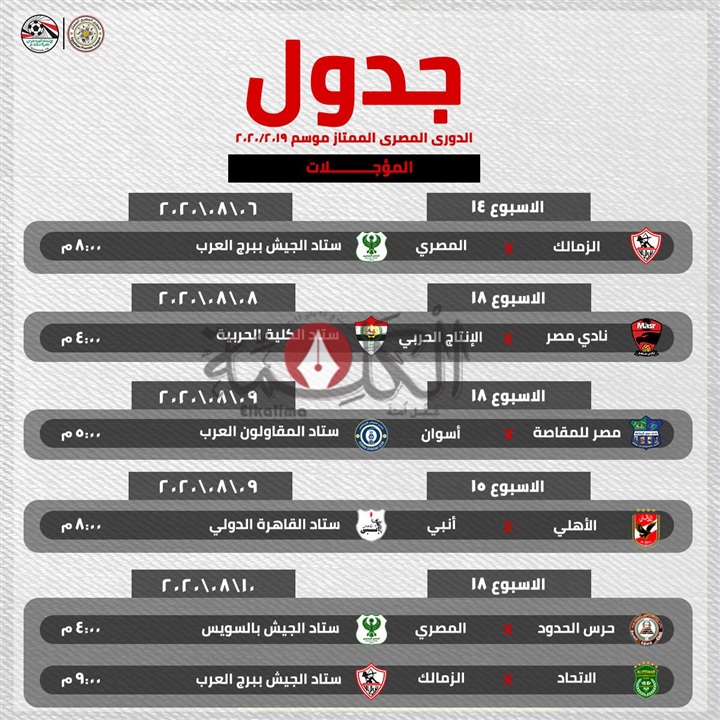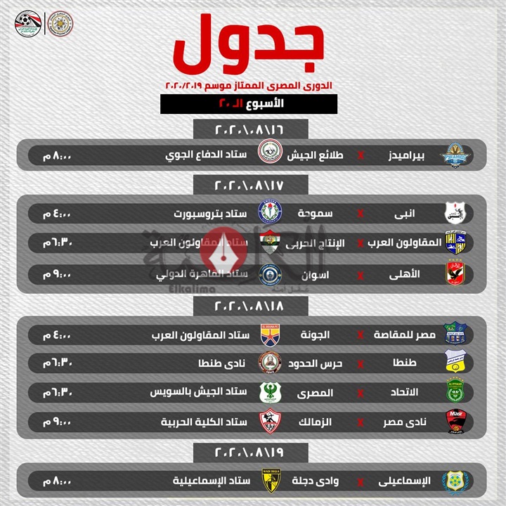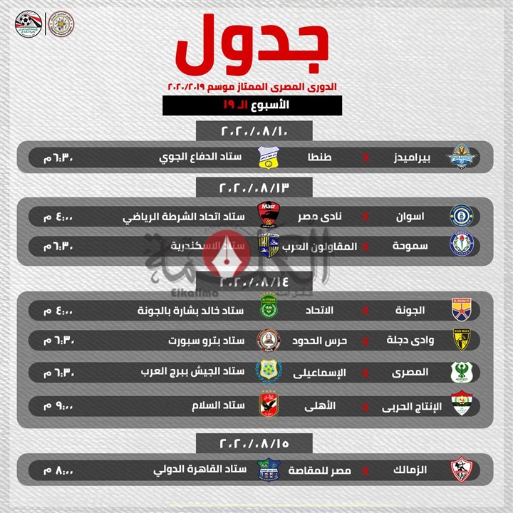 أعلنت إدارة المسابقات بالاتحاد المصري لكرة القدم جدول مسابقة الدوري الممتاز للموسم الحالي 19-2020 الذي تقرر استئنافه اعتبارا من 6 أغسطس المقبل بعد فترة توقف اضطرارية بسبب جائحة كورونا.
