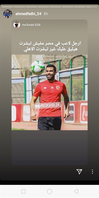 وكتب أحد متابعي أحمد فتحي: "أرجل لاعب في مصر.. مفيش تيشيرت هيليق عليك غير تيشيرت الأهلي"، ليقوم أحمد فتحي بإعادة نشرها.