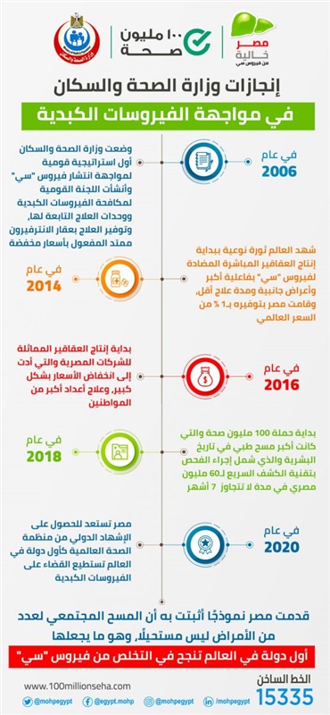 5-في عام 2020، مصر تستعد للحصول علي الإشهاد الدولي من منظمة الصحة العالمية كأول دولة في العالم تستطيع القضاء علي الفيروسات الكبدية.