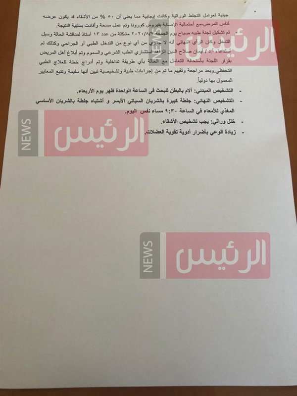 وشكلت لجنة طبية صباح الجمعة 7 أغسطس من 13 أستاذا لمناقشة الحالة وسبل التدخل وكان الرأى النهائى أنه لا جدوى من التدخل الطبى أو الجراحى، وتم استدعاء أ.د إيمان صلاح الدين الزاهد استشارى الطب الشرعى والسموم، وإبلاغ أهل المريض بقرار اللجنة باستحالة التعامل مع الحالة بطريقة تداخلية، وتم إدراج خطة للعلاج الطبى التحفظى، وبعد مراجعة وتقييم ما تم من إجراءات طبية وتشخيصية تبين أنها سليمة وتتبع المعايير المعمول بها دوليا.