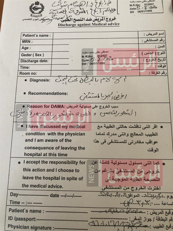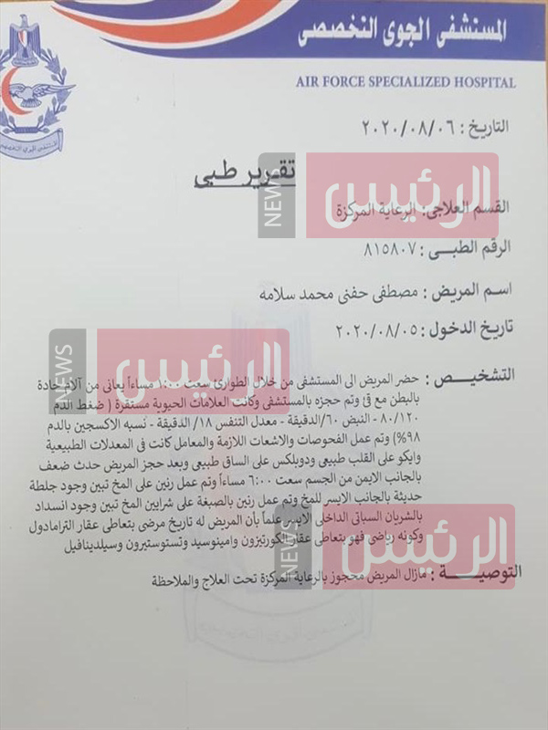 وحضر المريض إلى قسم الاستقبال بالمستشفى الجوي التخصصي فى الساعة الواحدة ونصف صباح الأربعاء الموافق 5 أغسطس، بآلالام في البطن، وبالبحث بالموجات الصوتية وبعض التحاليل تم التنبيه عليه بالدخول إلى المستشفى إلا أنه رفض، ووقع بالخروج على حسب طلبه ضد النصيحة الطبية.