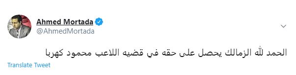 وكتب أحمد مرتضى عبر حسابه الشخصي على تويتر: "الحمد لله الزمالك يحصل على حقه في قضيه اللاعب محمود كهربا".