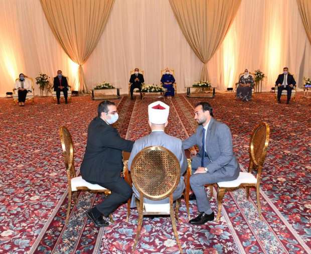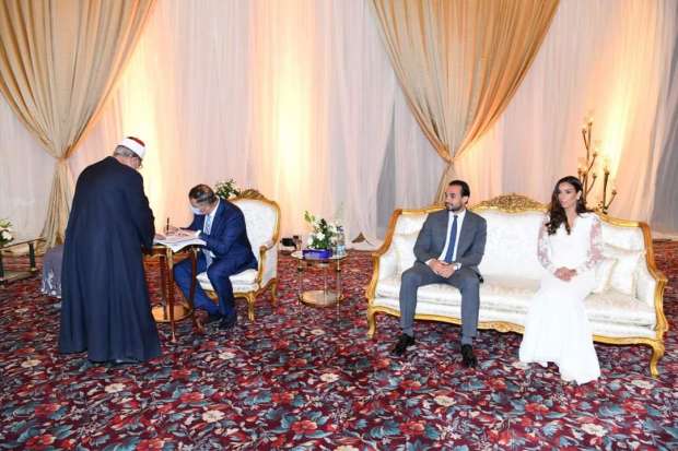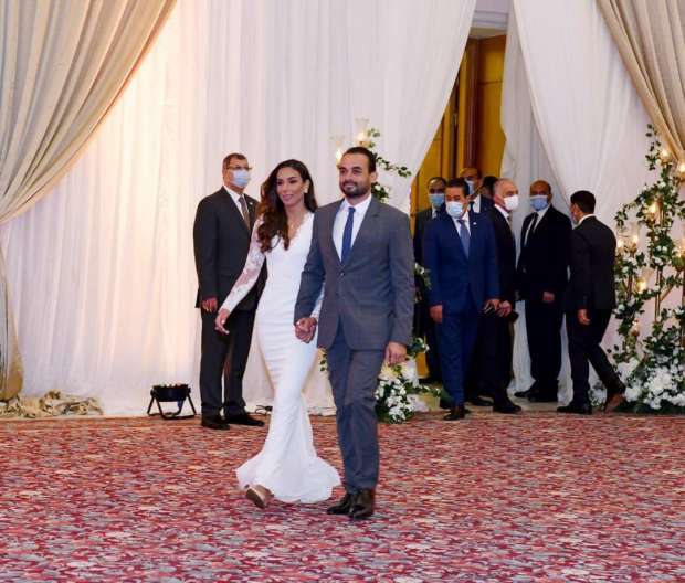 وارتداء الكمامات وفي حضور عدد قليل جدا من أسرة العروس ومصطفى مدبولي رئيس الوزراء.