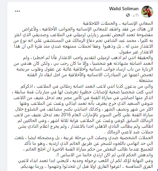 وكتب وليد سليمان: "لأن هناك من افتقد للمعاني الإنسانية والجوانب الأخلاقية، ولأغراض مفضوحة تعمد البعض تفسير زيارتي لزميلي في الملاعب وصديقي الذي اعتز به كثيرا، محمد عبد الشافي نجم دفاع الزمالك في المستشفي علي ـنه نوع من الاعتذار مني له .. بل وذهبوا وفقا لحملات ممنهجه ضدي منذ فترة إلى أن هذا الاعتذار غير مقبول".