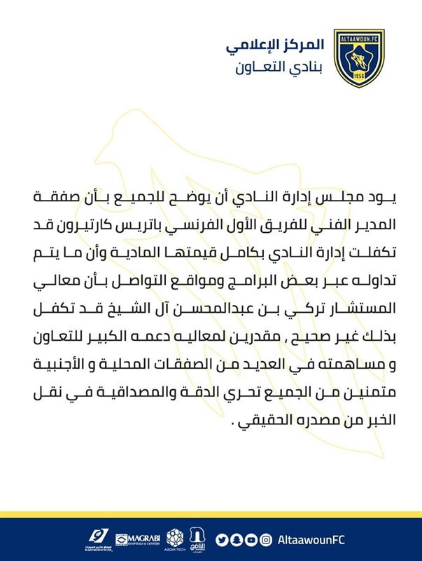 وأشار نادي التعاون إلى أنه يقدر دعم المستشار تركي آل الشيخ للنادي خلال الفترة الماضية، مطالباً وسائل الإعلام بتحري الدقة والمصداقية.