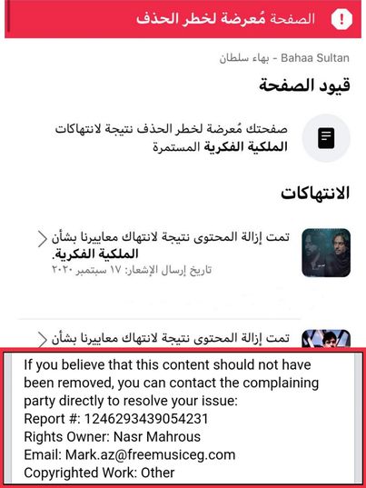 وكتب سلطان على حسابه: "محاولات مستمرة من جانب شركة فري ميوزك (نصر محروس) لغلق صفحتي الرسمية على الفيسبوك.. مما اضطر فريق العمل لدي بمسح جميع الفيديوهات التي أشارك بها جمهوري، بسبب بلاغات (يدوية) تقدمها الشركة لفريق عمل الفيسبوك لكل مقطع فيديو يحمل صوتي مما جعل الصفحة معرضة لخطر الحذف".