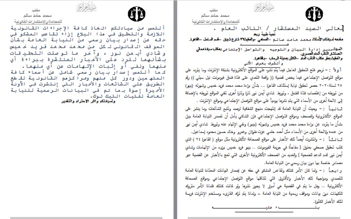 تقدم محمد حامد سالم المحامى، بالتماس إلى النائب العام، طالب فيه بفتح تحقيق عاجل فيما يتم نشره على المواقع الإلكترونية بشبكة الإنترنت وما يتردد على مواقع التواصل الاجتماعي فيما يخص قضية واقعة التعدي على فتاة فندق فيرمونت نيل سيتي رقم 25 لسنة 2020 حصر تحقيق نيابة استئناف القاهرة، وذلك بشأن براءة محمد محمد فريد خميس وشهرته بيبو من تورطه من اغتصاب فتاة الفندق، وتورط شادي أيمن نور تارة وتارة أخرى تنفي المواقع تورطه بالإضافة إلى لائحة أخرى من الأسماء التي يتم نشرها يومياً على مواقع التواصل الإجتماعي ومواقع الإنترنت.