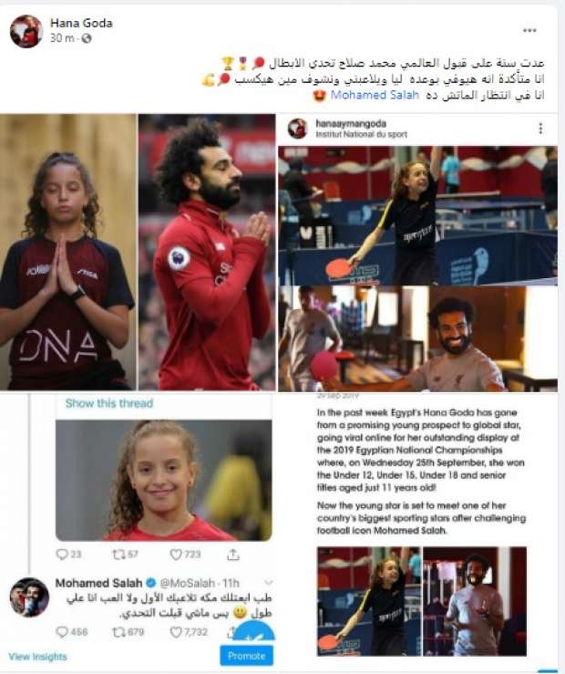 جددت هنا جودة لاعبة الأهلي والمنتخب الوطني لتنس الطاولة، طلبها لمحمد صلاح لاعب ليفربول الإنجليزي والمنتخب الوطني لكرة القدم، بإقامة مباراة بينهما.