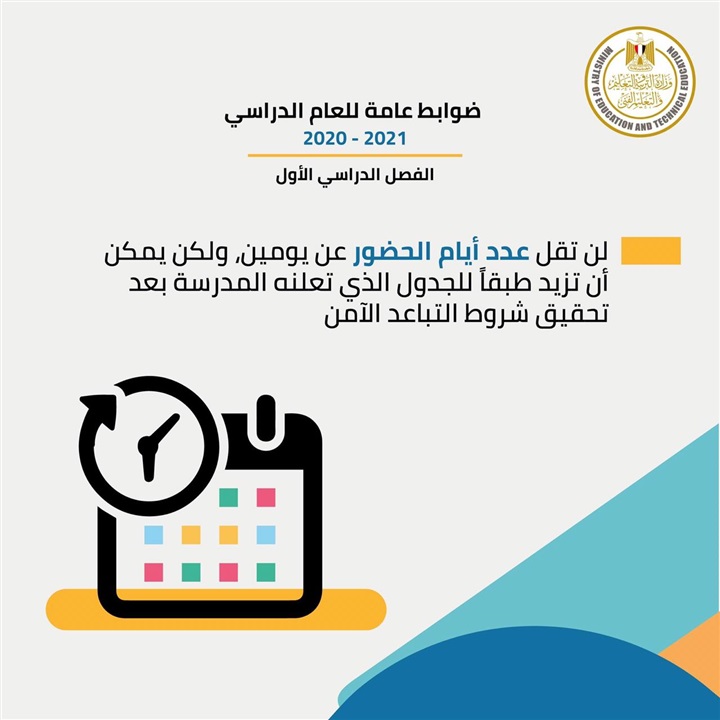 - لن تقل عدد أيام الحضور عن يومين، ولكن يمكن أن تزيد طبقاً للجدول الذي تعلنه المدرسة بعد تحقيق شروط التباعد الآمن.