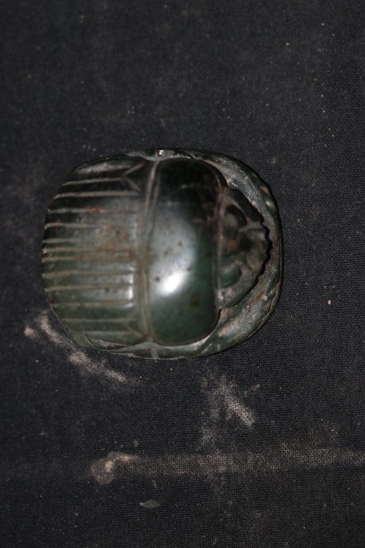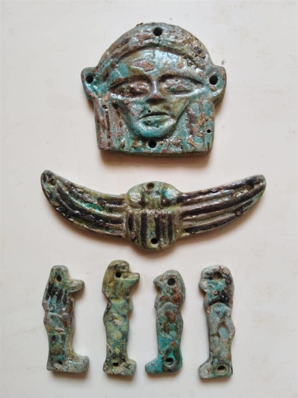 وأوضح الدكتور مصطفى وزيرى الأمين العام للمجلس الأعلى للآثار ورئيس البعثة، أنه أثناء فحص التابوت بعد فتحه تم العثور على مجموعة من التمائم عبارة عن جعران القلب وجعران مجنح وتميمة على هيئة رأس حتحور وتمائم أخرى تمثل أبناء حورس الأربعة.