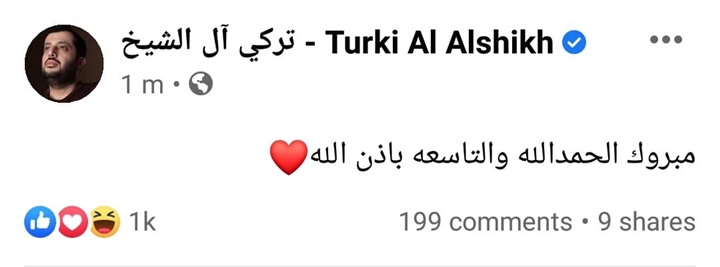 وكتب تركي آل الشيخ عبر حسابه على موقع التواصل الاجتماعي: "مبروك الحمد لله والتاسعة بإذن الله".