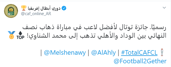 ونشر الحساب الرسمي لـ "كاف" عبر موقع التواصل الإجتماعي "تويتر": "رسميًا. جائزة توتال لأفضل لاعب في مباراة ذهاب نصف النهائي بين الوداد والأهلي تذهب إلى محمد الشناوي".