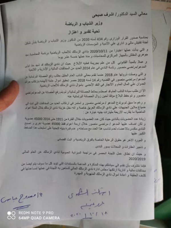 وذكر مصدر مقرب من ممدوح عباس بتسليم المستندات إلى 3 جهات رسمية من أجل التحقيق في تلك المخالفات، وهم وزارة الرياضة والجهاز المركزى للمحاسبات واللجنة الأولمبية المصرية.