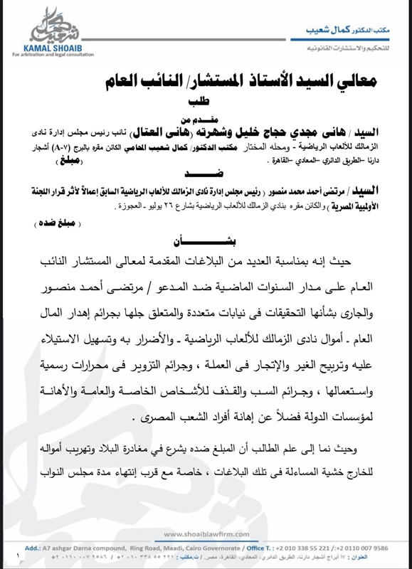 وأضاف العتال أنه يقوم بذلك حفاظا على نادي الزمالك وأموال نادي الزمالك، مشيرا إلى أن طلبه هذا يأتي بمناسبة العديد من البلاغات المقدمة لمعالي المستشار النائب العام على مدار السنوات الماضية ضد المعزول والجاري بشأنها التحقيقات في نيابات متعددة متعلقة بجرائم إهدار المال العام وأموال نادي الزمالك للألعاب الرياضية.