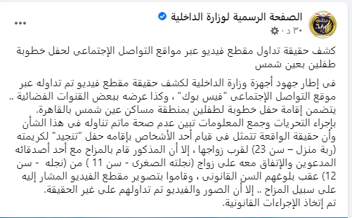 وقالت الوزارة :" إنه فى إطار جهود أجهزتها لكشف حقيقة مقطع فيديو تم تداوله عبر موقع التواصل الاجتماعى "فيسبوك"، وعرضه ببعض القنوات الفضائية، يتضمن إقامة حفل خطوبة لطفلين بمنطقة مساكن عين شمس بالقاهرة".