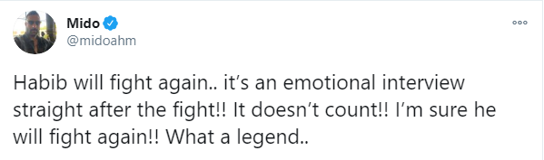 وغرد "ميدو" على حسابه على موقع التواصل الاجتماعي "تويتر": "حبيب سيقاتل مرة أخرى، إنها مقابلة عاطفية مباشرة بعد القتال".