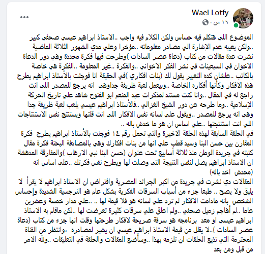 وأضاف لطفي: "في الحلقة السابقة والتي تحمل رقم ١٤ فوجئت بالأستاذ ابراهيم يطرح فكرة المقارنة بين حسن البنا وسيد قطب علي أنها من بنات افكاره وهي بالمصادفة البحتة فكرة مقال كتبته في جريدة الوطن منذ ثلاثة أسابيع تحت عنوان (حسن البنا نبي الارهاب) والمفارقة المدهشة أن الأستاذ إبراهيم يصل لنفس النتيجة التي وصلت لها ويطرح نفس فكرتك"، موضحًا: "المقالات دي نشرت في جريدة من أكبر الجرائد المصرية وأفتراض أن الأستاذ إبراهيم لا يقرأ لا يليق ولا يصح، طبعا جزء من أسباب السرقات الفكرية بشكل عام هو النرجسية الشديدة وإحساس الشخص بأنه مادامت الأفكار لم ترد علي لسانه هو فلا قيمة لها علي مدار خمسة وعشرين عاما، لم أهاجم زميل صحفي ولم أعلق علي سرقات كثيرة تعرضت لها لكن ماقام به الاستاذ ابراهيم عيسي او معد برنامجه هو سرقة صريحة لأفكار طرحتها وقلت أنها جزء من كتاب (دعاة عصر السادات)".