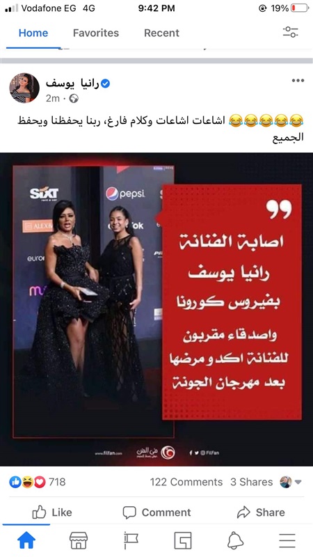 ردت الفنانة رانيا يوسف على ما تم تداوله بشأن إصابتها بفيروس كورونا، عقب عودتها من الجونة.