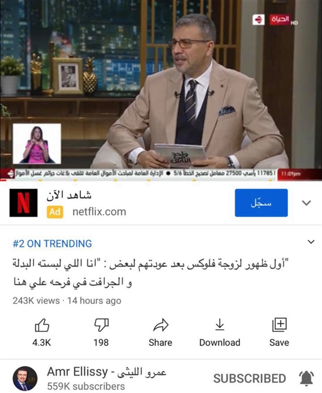 حققت حلقة النجم أحمد فلوكس مع الإعلامي د. عمرو الليثي ببرنامج "واحد من الناس" علي قناة الحياة، أعلي نسب مشاهدة " تريند " حيث تحتل حتى الآن المركز الثانى، لأكثر الفيديوهات مشاهدة على موقع يوتيوب، وسط تفاعل كبير من المتابعين عبر موقع الفيديوهات العالمي" يوتيوب "، كما حققت الحلقة مشاهدات عالية جدا عبر شاشة الحياة.