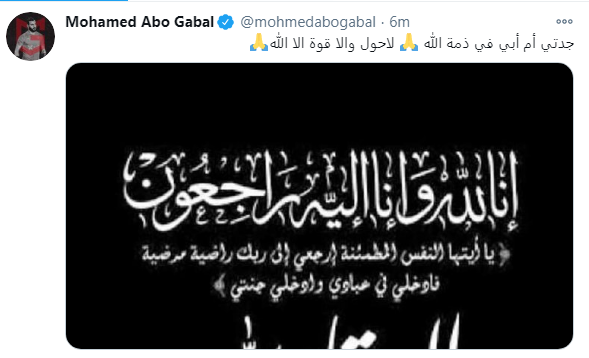 وكتب "أبو جبل" عبر صفحته الشخصية بموقع التواصل الاجتماعي "فيس بوك": "جدتي أم أبي في ذمة الله لا حول ولا قوة إلا بالله".