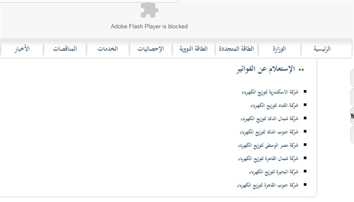2- بالدخول على موقع وزارة الكهرباء للاستعلام عن فاتورة كهرباء بشركة مصر العليا على الرابط (http://www.moee.gov.eg/test_new/serv2.aspx ) يتبين أن أسم شركة مصر العليا غير موجود على الإطلاق ضمن باقى شركات التوزيع التى لها روابط ثابتة للاستهلاك ومعلومات تعريفية عن الشركة بدءا من كلمة رئيس الشركة حتى الاستعلام والاستفسار عن الفواتير والإبلاغ عن الأعطال والمعلومات الاسترشادية.