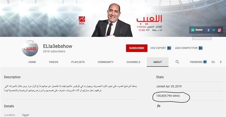 بعدما يقرب من عام ونصف على إطلاق الحسابات الرسمية لبرنامج "اللعيب"، الذي يُقدمه الإعلامي مُهيب عبد الهادي على شاشة MBC مصر، حققت فقرات البرنامج اليوم عبر "اليوتيوب" نسبة مُشاهدة تجاوزت 100 مليون مُشاهدة وهو رقم قياسي للبرامج الرياضية، وفي الوقت ذاته وصل عدد مُتتبعي البرنامج عبر "اليوتيوب" 261 ألف مُشترك.