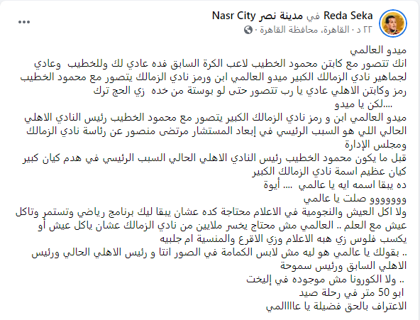 وكتب رضا سيكا عبر حسابه على موقع التواصل الاجتماعي "فيس بوك": "ميدو العالميانك تتصور مع كابتن محمود الخطيب لاعب الكرة السابق فده عادي لك وللخطيب وعادي لجماهير نادي الزمالك الكبير ميدو العالمي ابن ورمز نادي الزمالك يتصور مع محمود الخطيب رمز وكابتن الاهلي عادي يا رب تتصور حتى لو بوستة من خده".