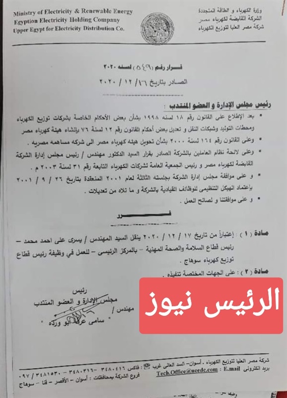 أصدر المهندس سامي عرفه أبو وردة، رئيس مجلس إدارة شركة مصر العليا لتوزيع الكهرباء القرار رقم (549) لسنة 2020 و الصادر بتاريخ ،أمس الأربعاء، الموافق 16 ديسمبر الجاري بنقل المهندس يسري علي أحمد محمد، من قطاع الصحة والسلامة المهنية، وتعيينه رئيسًا لقطاع توزيع كهرباء سوهاج، خلفا للمهندس ابراهيم الحويج لبلوغه سن التقاعد.