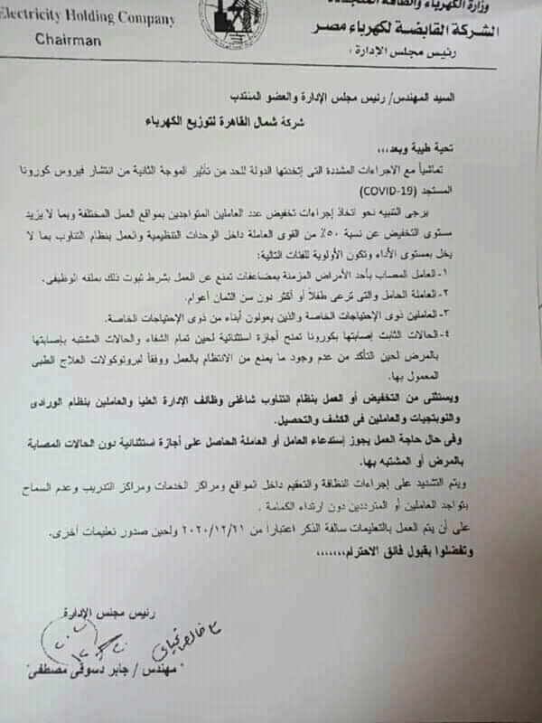 أصدر المهندس جابر دسوقي، رئيس الشركة القابضة لكهرباء مصر تعليمات مشددة للشركات التابعة بتخفيف عدد العاملين المتواجدين بمواقع العمل المختلفة بما لا يزيد عن مستوى التخفيض عن 50% من قوة العمل.