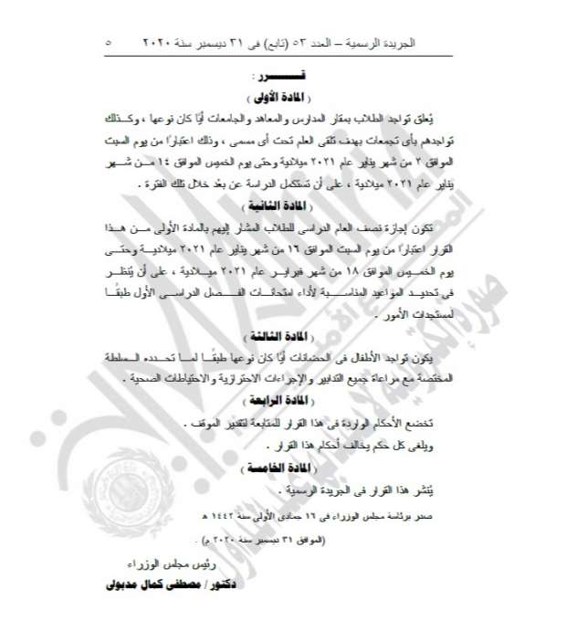 ونص قرار للدكتور مصطفى مدبولي، رئيس مجلس الوزراء، الذي حمل رقم 2726 لسنة 2020، والخاص بـ«التعليق وإجازة منتصف العام وموقف الحضانات»، في مادته الثالثة على: «يكون تواجد الأطفال في الحضانات أياً كان نوعها طبقاً لما تحدده السلطة المختصة مع مراعاة جميع التدابير، والإجراءات الاحترازية، والاحتياطات الصحية».