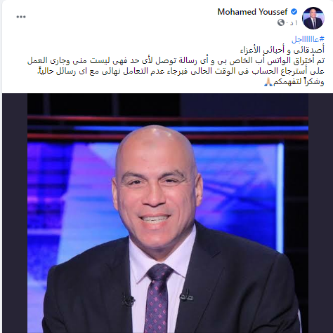 وكتب محمد يوسف عبر حسابه على "فيس وبوك": "أصدقائى و أحبائى الأعزاءتم أختراق الواتس أب الخاص بى و أى رسالة توصل لأى حد فهى ليست منى وجارى العمل على أسترجاع الحساب فى الوقت الحالى فبرجاء عدم التعامل نهائى مع اى رسائل حالياً.وشكراً لتفهمكم".