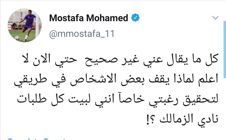وكتب مصطفى محمد عبر حسابه الشخصي على موقع التواصل الاجتماعي "تويتر": "كل ما يقال عني غير صحيح حتي الان لا اعلم لماذا يقف بعض الاشخاص في طريقي لتحقيق رغبتي خاصآ انني لبيت كل طلبات نادي الزمالك ؟!".