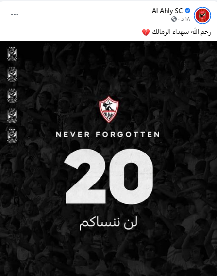 ونشرت الصفحة الرسمية للنادي الأهلي على مواقع التواصل الاجتماعي، صورة تحمل شعار نادي الزمالك و«الرقم 20»، لتخليد ذكرى شهداء الدفاع الجوي وعلقت على الصورة: «رحم الله شهداء الزمالك».