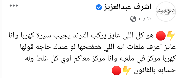 وكتب أشرف عبدالعزيز، عبر صفحته الشخصية على موقع التواصل الاجتماعي "فيس بوك":"هو كل اللي عايز يركب الترند يجيب سيرة كهربا".