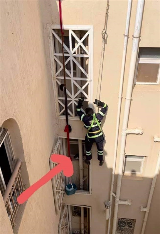 ووقعت القطة من السطح أعلى مواسير داخل منور ولم يستطع الأهالى إنقاذها لمدة أسبوع، ولكن تمكنوا من توصيل الطعام لها عن طريق صندوق بحبل داخل منور العقار.