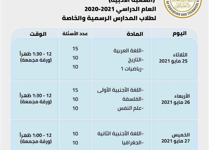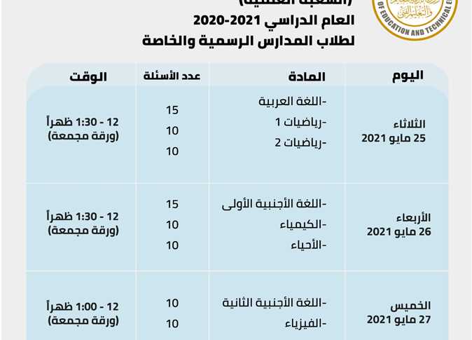 وتكون مواعيد الامتحانات في شهور أبريل ومايو حسب الجداول التالية