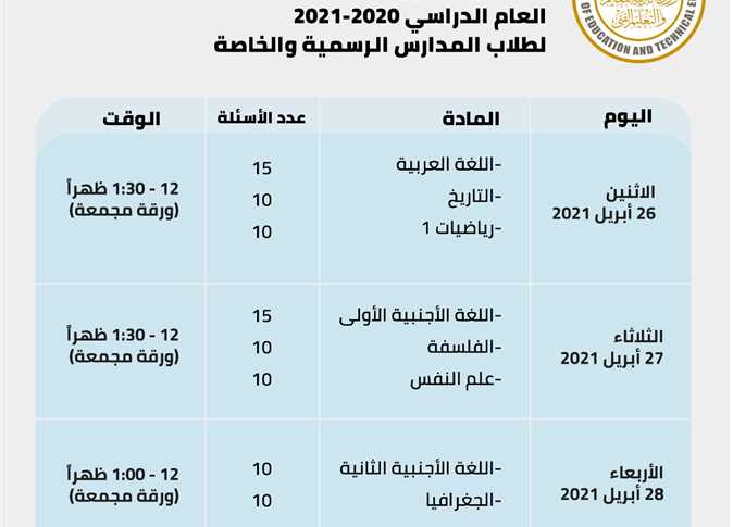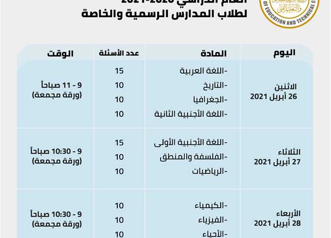 بالمدارس الرسمية والخاصة وكذلك مواعيذ امتحانات شهر ابريل ومايو كالتالي: