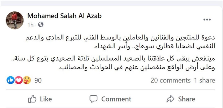 وكتب العزب على "فيس بوك":"دعوة للمنتجين والفنانين والعاملين بالوسط الفني للتبرع المادي والدعم النفسي لضحايا قطاري سوهاج.. وأسر الشهداء.. مينفعش يبقى كل علاقتنا بالصعيد المسلسلين تلاتة الصعيدي بتوع كل سنة.. وعلى أرض الواقع منفصلين عنهم في الحوادث والمصائب".